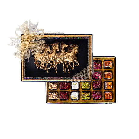 Χειροποίητη ειδική τουρκική απόλαυση σε χρυσό κουτί με κορνίζα από άλογα