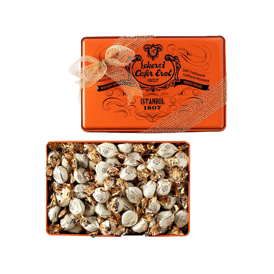 Deléitese con los ricos sabores de nuestro Caramelo de Chocolate, elegantemente presentado en una caja de lata retro de 650 g. Nuestra exquisita golosina está cuidadosamente elaborada con una mezcla de ingredientes de alta calidad que garantizan una deliciosa experiencia en cada bocado.
