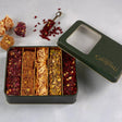 A fémdoboz belsejében különféle ízeket talál, hogy ízlelőbimbóit megkínálhassa. A fügével és dióval ízesített török csemegétől kezdve a külső pisztácián át a fahéjjal ízesített finomságokig minden egyes darab a minőség és az ízek iránti elkötelezettségünkről tanúskodik.