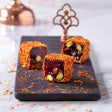Skäm bort dig med den utsökta smakblandningen med vår saffranbelagda Turkish Delight med granatäpplesmak och pistaschmandlar. Upplev den härliga kombinationen av kokta pistaschmandlar med granatäpplesmak, belagda med lyxig saffran.